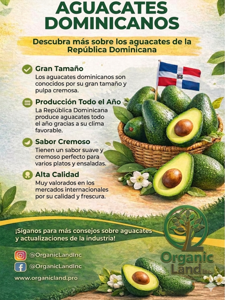 Nuestros aguacates dominicanos son de origen y exportación por Organic Land SRL y importados y distribuidos en EE. UU. por Organic Land Inc.